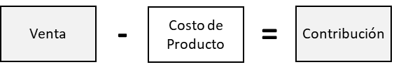 La resta entre la Venta y el Costo de Producto nos da como resultado el componente Contribución, que si lo dividimos entre la venta nos dará el conocido Gross Margin o Margen de Contribución del producto.