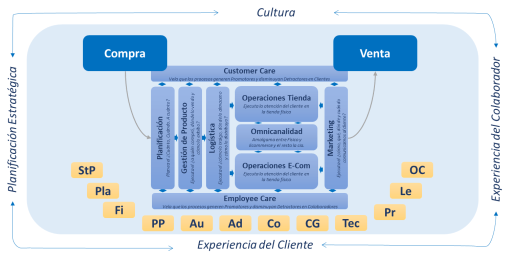 Cada uno de estos procesos los podemos aperturar en 3 grandes funciones, que determinan el marco de trabajo general del negocio retail.