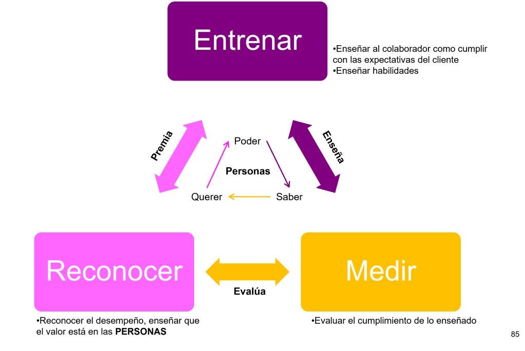 (3) Construye un Programa de Servicio alrededor de las personas, dentro de todas las evaluaciones de correlación en los diferentes puntos de contacto y journey del cliente hay un punto común, que al momento en que hay una interacción entre el cliente y un colaborador el atributo de Atención toma una importancia relativa superior a los Procesos. El Programa de Servicio tiene que centrarse en las personas, partiendo por encontrar la motivación acertada en los colaboradores que gatillen un deseo hacia mejorar (Querer <> Reconocimiento idóneo); se debe desarrollar un programar de capacitación y formación ‘adhoc’ no sólo a las necesidades sino al estilo y cultura de los colaboradores para que asimilen y ejecuten más rápido lo aprendido para lograr llegar a mejorar (Poder <> Entrenamiento ‘adhoc’); se debe generar una retroalimentación y feedback constante muy frecuente que implica un liderazgo y comunicación permanente para que conozcan que deben mejorar (Saber <> Medición concreta y frecuente).
